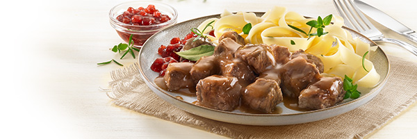 Zartes Hirschfleisch in einer würzigen Rotwein-Preiselbeer-Sauce - fein abgeschmeckt. Nur noch erhitzen und genießen.