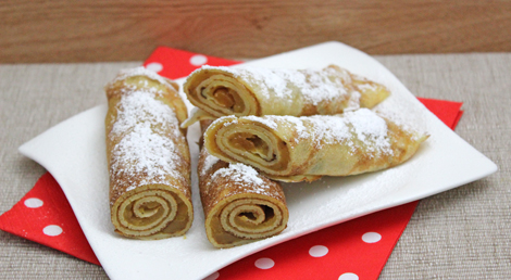 Die Crêpes schmecken auch kalt als Dessert! Für Portionshäppchen die aufgerollten Crêpes einfach in dicke Scheiben schneiden und evtl. mit einem Holzstäbchen fixieren.