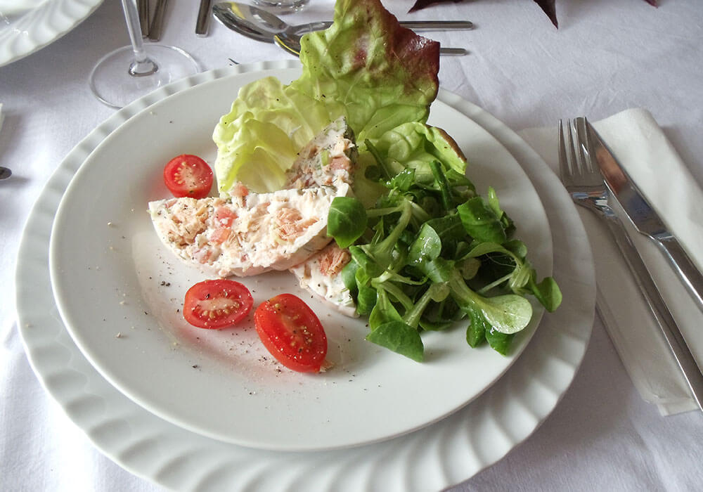 Eine köstliche Fisch-Terrine als Vorspeise auf grünem Blattsalat. Unsere hochwertigen Lachsfilets naturell eigenen sich dafür hervorragend!