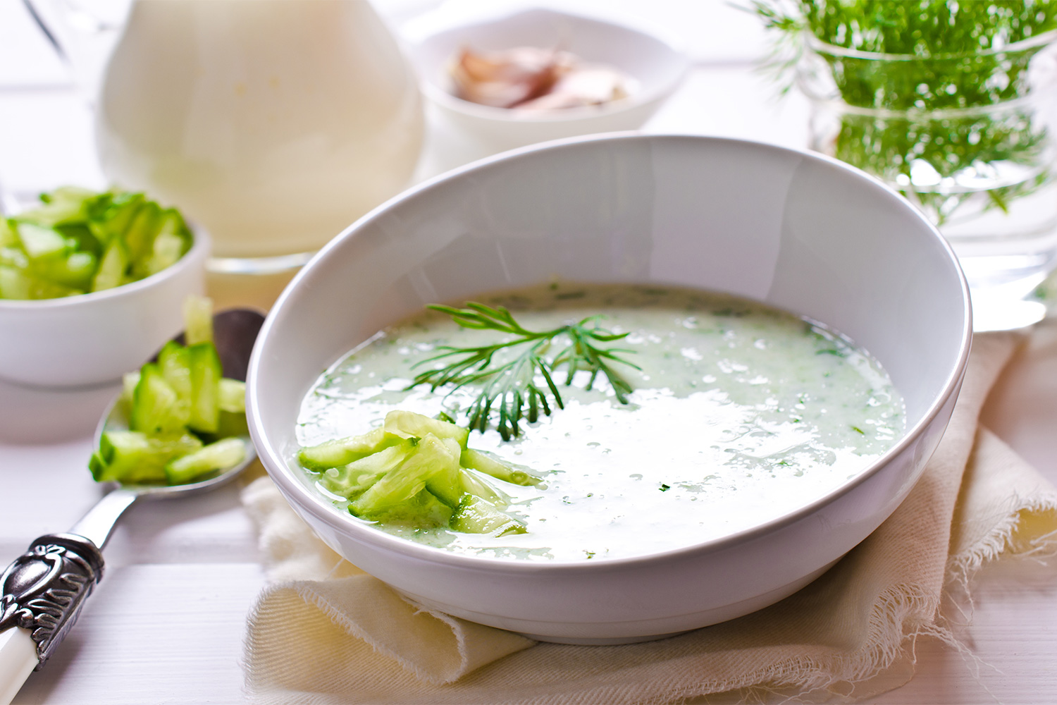 Die Gurkensuppe ist ein erfrischendes Mittagsgericht an heißen Sommertagen. Die Suppe kann hervorragend einen Tag im Voraus zubereitet werden, denn so ist sie beim Servieren optimal temperiert. Als Beilage empfehlen wir frisches Bauernbrot, unser Zupfbrot oder Mediterranes Stangenbrot.
