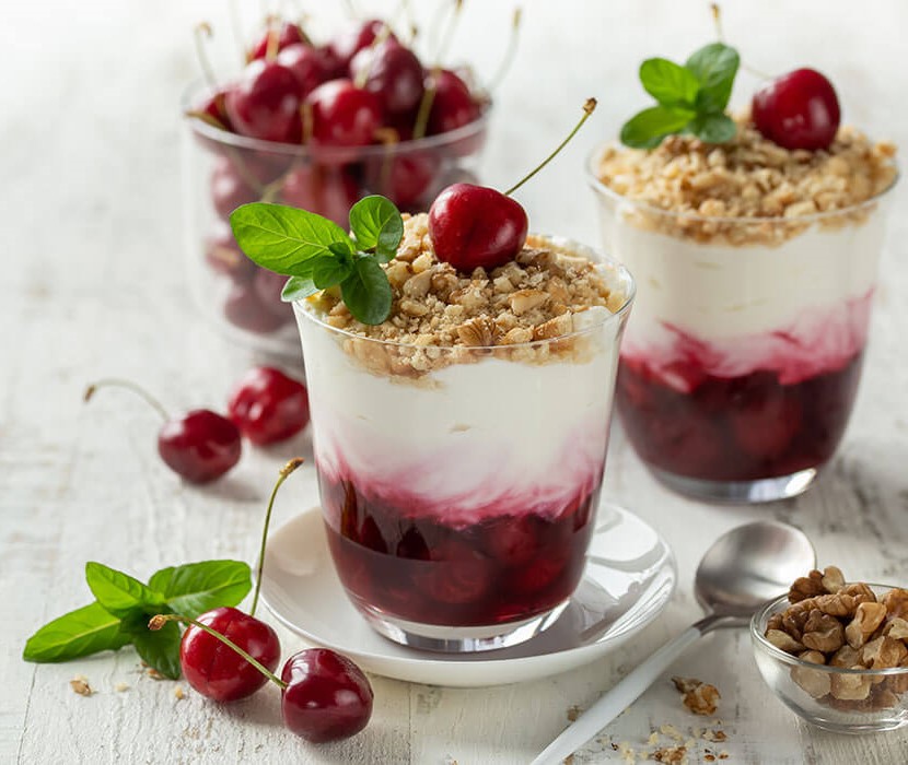 Die Cremes nach einer kurzen Ruhezeit von ca. 5 Minuten wie folgt in Gläser schichten: zuerst die Kaffeecreme, darauf die Egle Edel-Frucht Sauerkirsche und mit der Vanillecreme abschließen.
