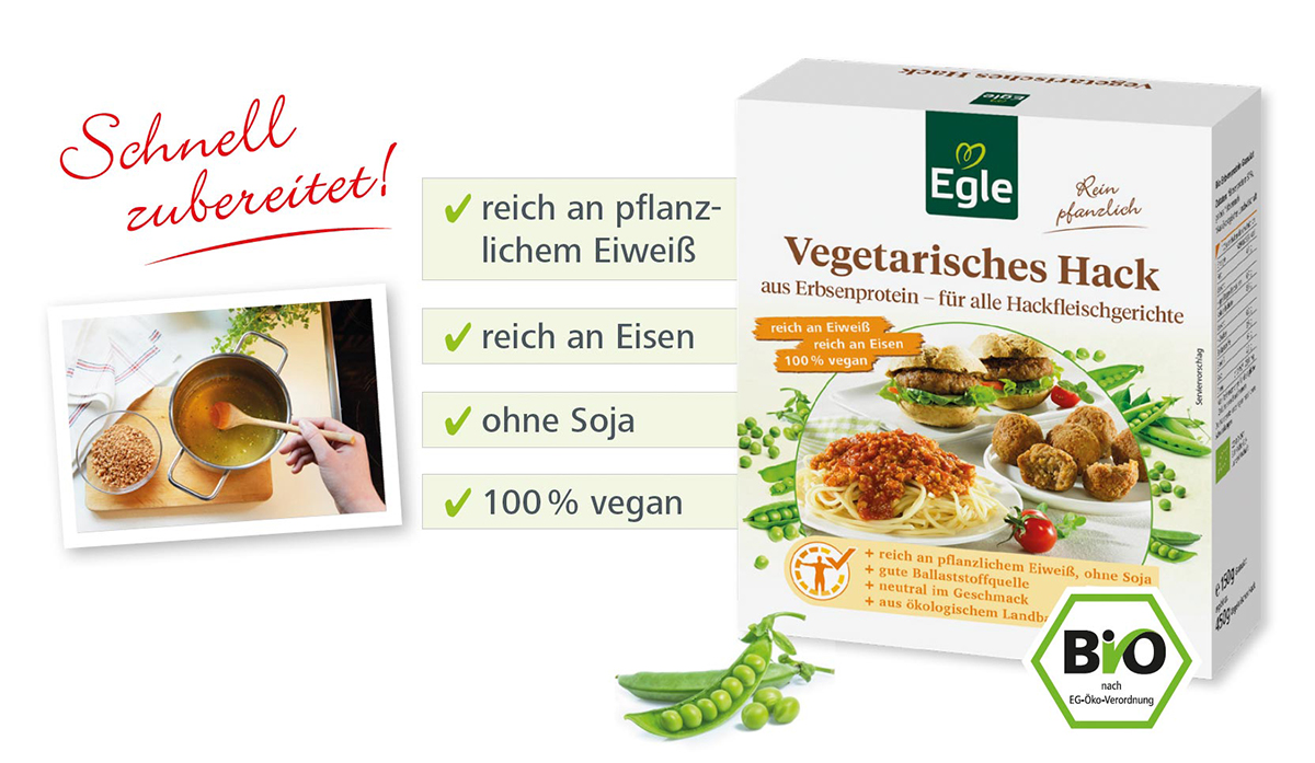 Aus Erbsen lässt sich Erbseneiweiß gewinnen, was sich hervorragend dazu eignet, einen pflanzlichen Fleisch-Ersatz herzustellen. Das vegetarische Hack von Egle enthält viel pflanzliches Eiweiß und der Biss sowie die Faserstruktur kommen Fleisch sehr nahe. Erbseneiweiß ist fast geschmacksneutral. Das bedeutet, dass das richtige Würzen, Braten oder Grillen für Aroma und Geschmack sorgt. Unser vegetarisches Hack ist aus Erbsen aus rein ökologischer Landwirtschaft hergestellt. Das Produkt ist 100 % vegan, ganz ohne chemische Zusatzstoffe und passt in den Ernährungsplan all derer, die sich bewusst und klimafreundlich ernähren möchten. Mit einem sehr hohen Eisengehalt bietet das vegetarische Hack auch all denen, die weniger Fleisch essen möchten, eine perfekte Alternative, um die wichtige Versorgung an Eisen trotz Fleischverzicht sicher zu stellen. Und das ohne auf Genuss verzichten zu müssen.
